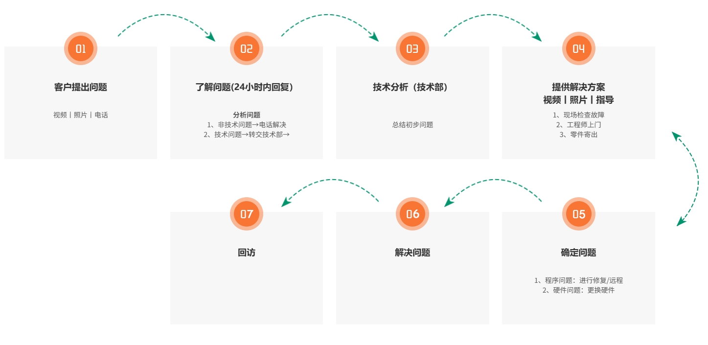 我們的設備有一年的保修期。客戶發現機器出現問題并聯系我們后,我們的售后人員會2小時內回復。并第一時間聯系技術人員分析問題點,提供解決方案,用最快的時間解決客戶問題。問題處理完畢,我們會有專門的電話回訪,詢問問題是否已解決,機器是否正常運作。